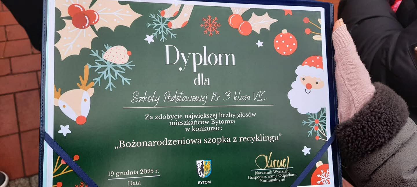 Uczniowie klasy 6c pod kierunkiem pani Sylwii Palik zdobyli I miejsce w konkursie miejskim na szopkę z recyklingu. Na pracę naszych uczniów głosowało ponad 2,5 tysiąca mieszkańców Bytomia. Bardzo się cieszymy i serdecznie gratulujemy!